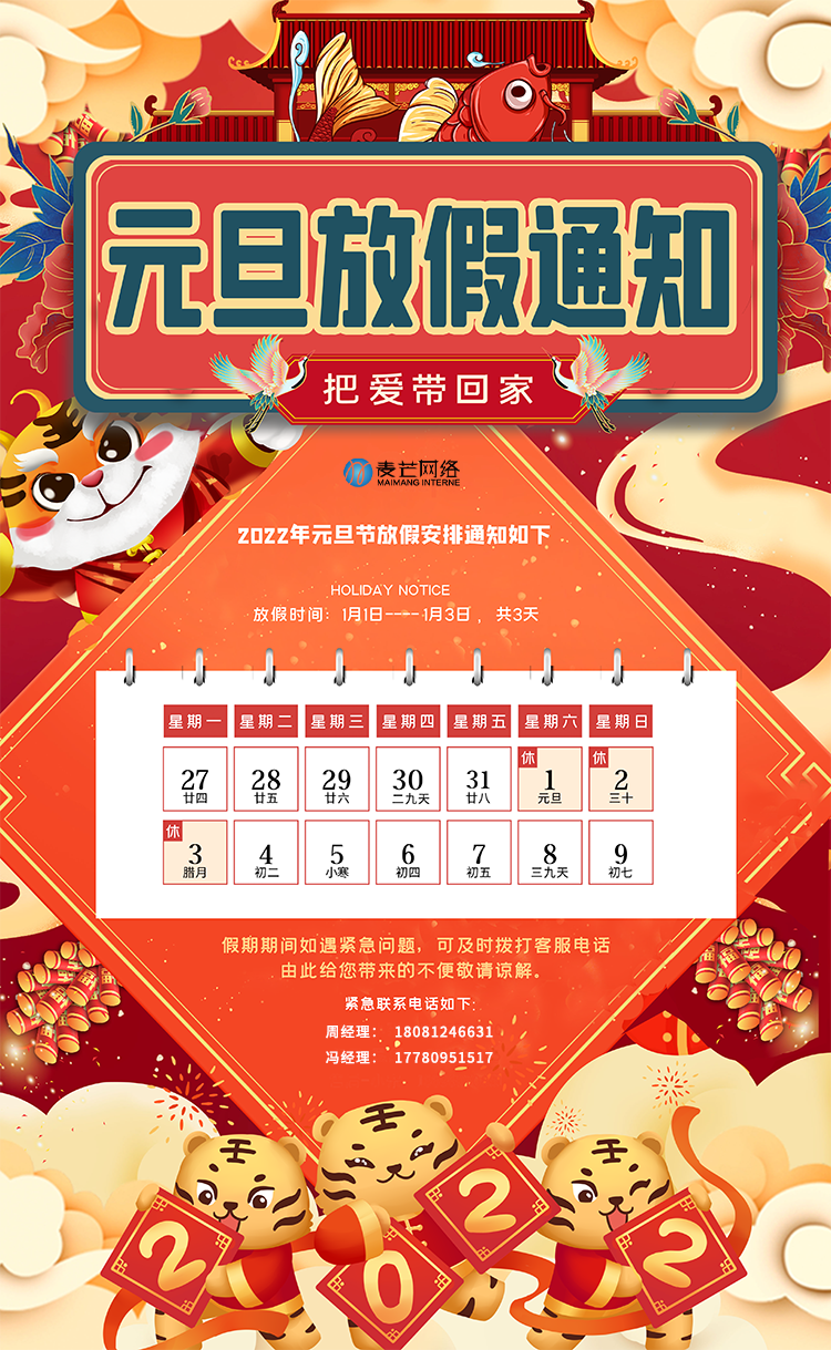 一、放假時間:2022年1月1日(星期六)至1月3日(星期一)放假,共計3天;1月4日(星期二)正常上班。